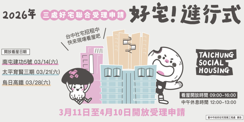 為讓申請人瞭解住宅環境及申請資格,住宅處也將於3/14(六)、3/21(六)、3/28(六)上午9時至下午4時,分別於「南屯區建功5號」、「太平區育賢三期」及「烏日區高鐵」等3處好宅舉辦現場看屋活動,開放參觀各房型樣品屋或實品屋及公設空間,每戶皆配有冷氣、窗簾、單人或雙人床箱、衣櫃、衛浴設備、上下廚櫃、流理臺、抽油煙機、瓦斯爐(或電陶爐、IH爐)、天然氣熱水器(或電熱水器)及燈具等傢俱(電),觀迎有興趣的民眾踴躍到場參觀。