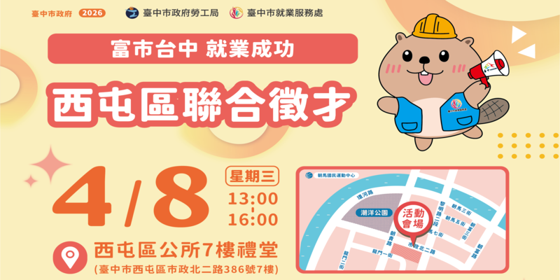 為響應世界地球日,台中市政府勞工局與西屯區公所攜手合作,將於4月8日(星期三)下午1點至4點,在西屯區公所7樓禮堂舉辦「無紙化智慧徵才」活動。此次徵才邀請矽品精密、屋馬燒肉、全聯等12家知名廠商,提供500個優質職缺,最高月薪上看6萬9,000元,邀請市民朋友體驗環保且高效率的數位求職新模式。