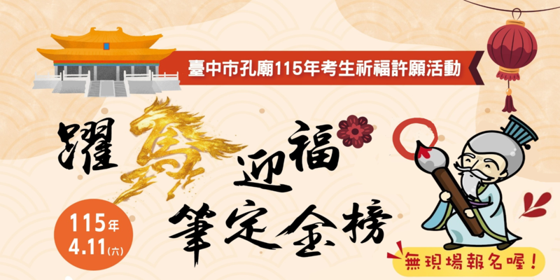 台中市孔廟補充,今年祈福活動自3月19日中午12時起至3月31日止開放網路報名(https://forms.gle/Ye7Snj61ajnopLBC6),限額600名,額滿為止。凡完成報名並於活動當天報到者,可領取祈願卡與智慧筆,書寫心願並懸掛於孔廟大成門前祈福架上;如完成報名但當日無法到場,也可委託親友代領,每人限領1份,歡迎考生、家長及市民朋友踴躍參與,一同為考試與人生重要時刻祈福集氣。(3/18*16)*民政局