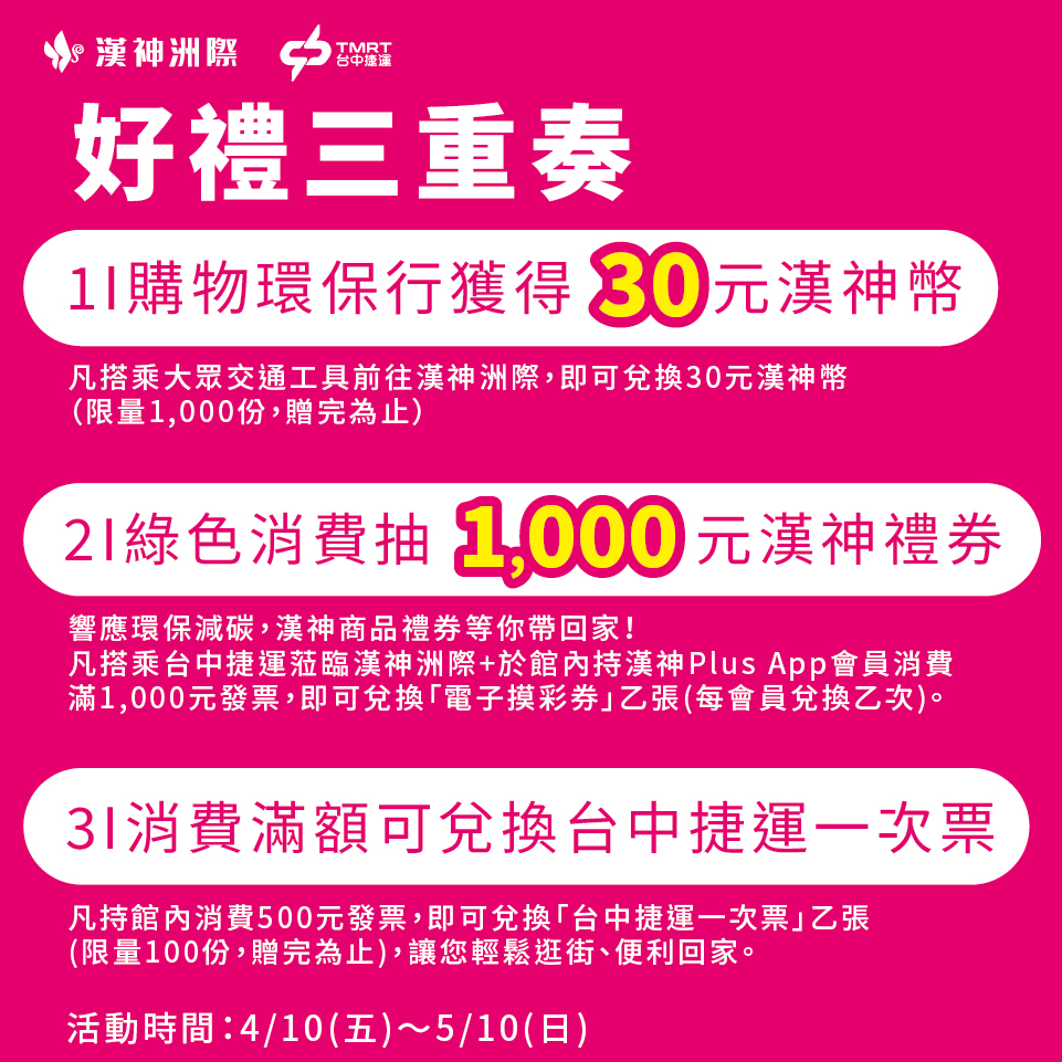 👉 第一重:持台中捷運紙本搭乘證明,兌換30元漢神幣(限量1,000份)