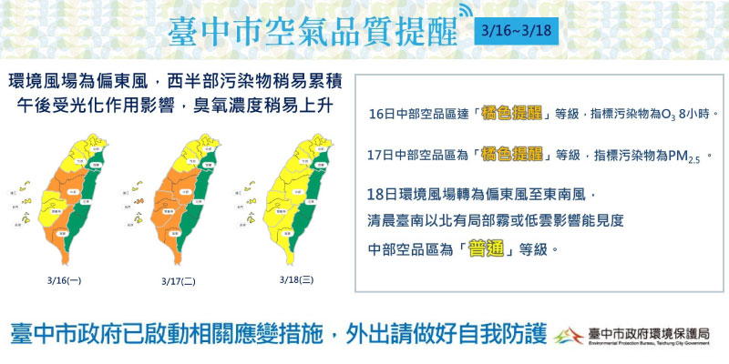 因受環境風場仍持續偏東風,環境部預報明(16)、後兩日環境風場為偏東風,西半部污染物稍易累積,午後受光化作用影響,臭氧濃度易上升。中部有達「橘色提醒」等級之虞,16日指標污染物為「臭氧八小時」、17日為「細懸浮微粒」,台中市政府持續啟動應變措施並監控空氣品質,並呼籲市民祭祖掃墓減少焚燒金紙,必要時戴上口罩,做好自我防護。