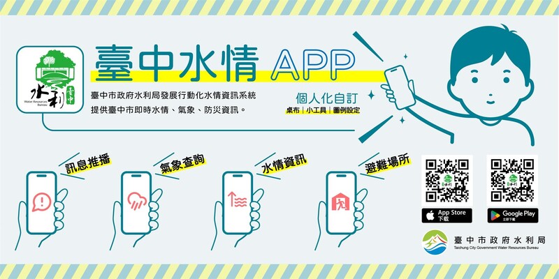 民眾欲知臺中水情大小事,請下載「臺中水情」APP,隨時報哩災~