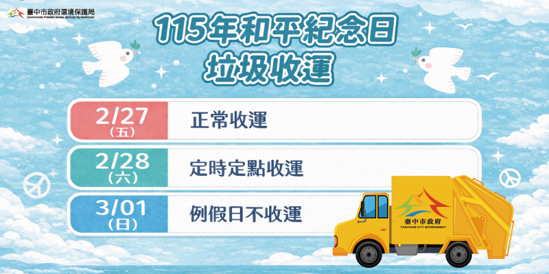 和平紀念日將至,台中市政府環境保護局為維持垃圾收運服務,於2月28日和平紀念日當天暫停沿街收運垃圾模式,改採「定時定點」垃圾收運服務,在全市廣設701處定點,每處停留時間約5至30分鐘,方便民眾倒垃圾,請市民提前掌握收運時間。